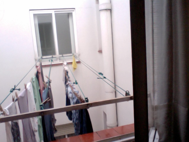 Photo is mine, taken with Photobooth, looking out into the light well of the building.
